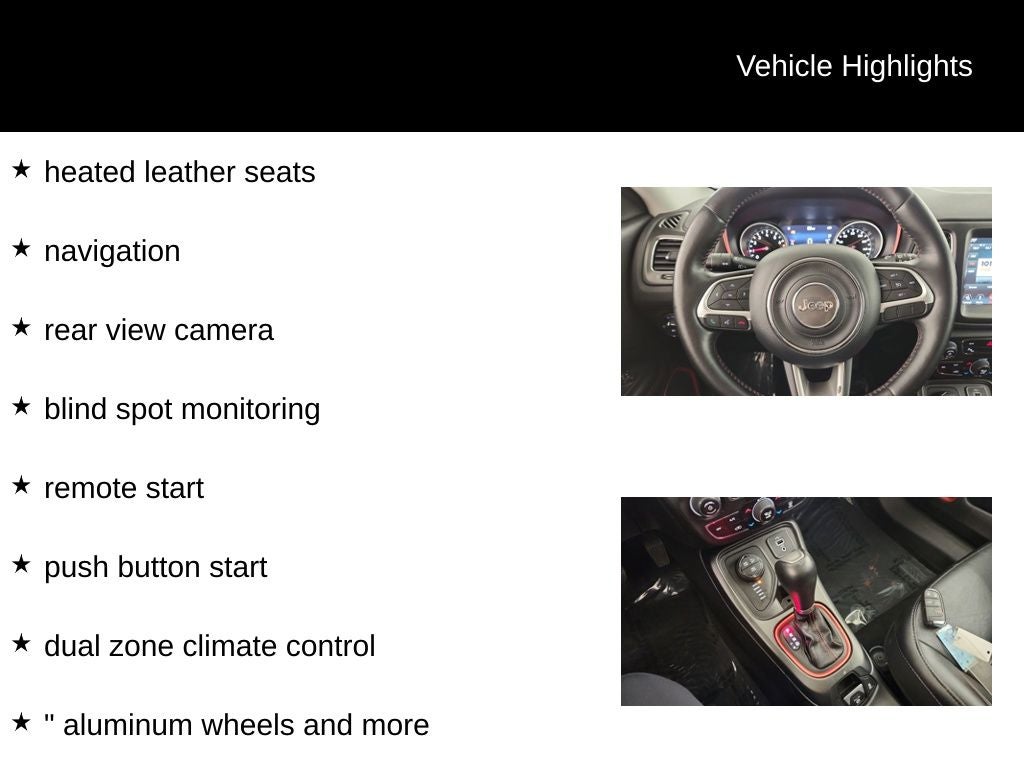 This 2019 Jeep Compass Trailhawk is equipped with a. 2.4L I4 heated leather seats, navigation, rear view camera, blind spot monitoring, remote start, push button start, dual zone climate control, 17 aluminum wheels and more.