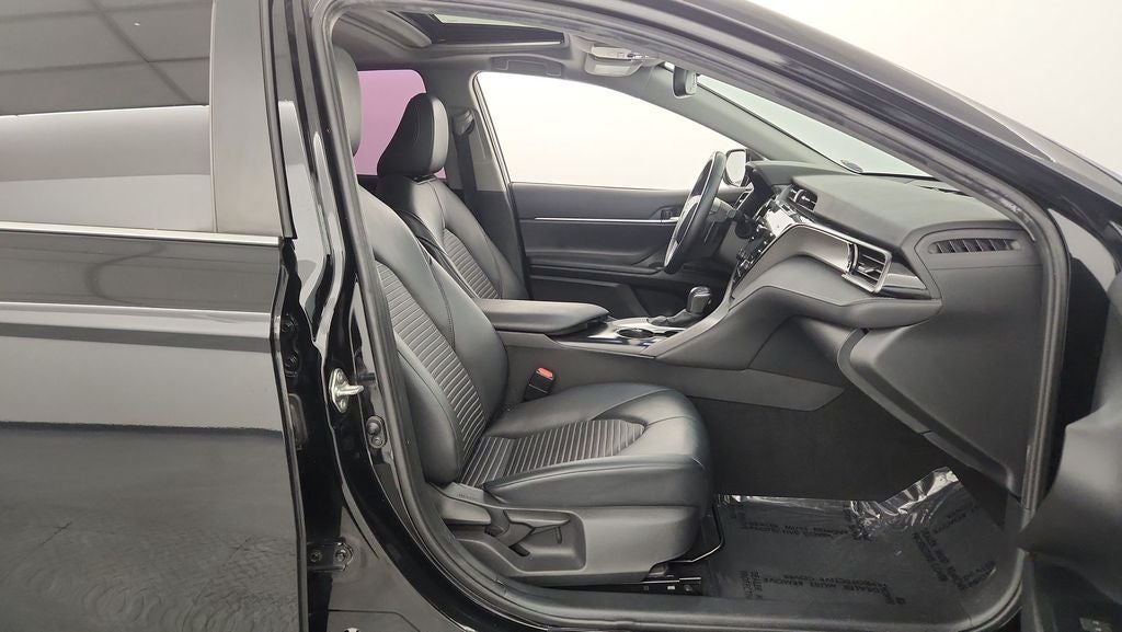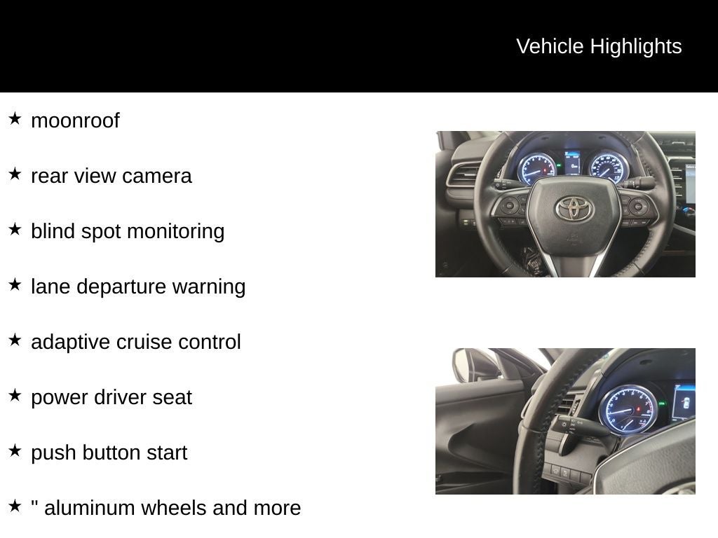 This is a one owner 2020 Toyota Camry SE with a clean Carfax. It's equipped with a. 2.5L I4 DOHC 16V moonroof, rear view camera, blind spot monitoring, lane departure warning, adaptive cruise control, power driver seat, push button start, Bluetooth®, power windows and locks, cruise control, steering wheel audio controls, satellite radio, 18 aluminum wheels and more.