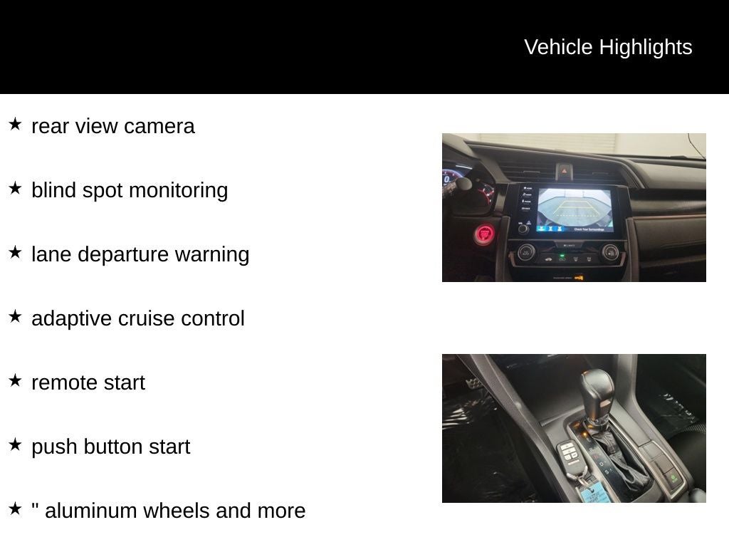 This 2021 Honda Civic Sport has a clean Carfax. It's equipped with a. 1.5L I4 DOHC 16V rear view camera, blind spot monitoring, lane departure warning, adaptive cruise control, remote start, push button start, 18 aluminum wheels and more.