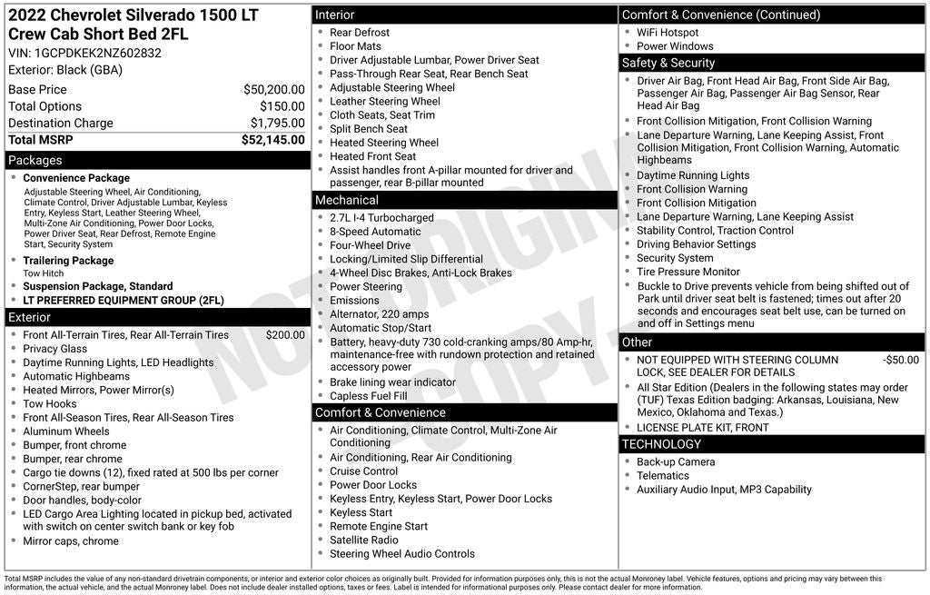 - Convenience Package includes (CJ2) dual-zone automatic climate control, (A2X) 10-way power driver seat including power lumbar, (KA1) heated driver and passenger seats, (NP5) leather-wrapped steering wheel, (KI3) heated steering wheel, (N37) manual tilt/telescoping steering column, (KI4) 120-volt power outlet, (KC9) 120-volt bed-mounted power outlet, (UBI) 2 charge-only USB ports for second row, (C49) rear-window defogger, (AVJ) Keyless Open and Start, (BTV) Remote Start and (UTJ) content theft alarm. (Vehicles built prior to 3-14-2022 and after 4-24-2022 include heated driver and front outboard passenger seats. Certain vehicles built on or after 3-14-2022 through 4-24-2022 will be forced to include (00V) Not Equipped with Heated or Ventilated Front Seats, which removes heated front seats. Vehicles equipped with (00V) Not Equipped with Heated or Ventilated Front Seats will be eligible for later dealer retrofit to enable functionality. Certain vehicles built prior to 3-28-2022 may be forced to include (00G) Not Equipped with Heated Steering Wheel, which removes the heated steering wheel. See dealer for details or the window label for the features on a specific vehicle.)
