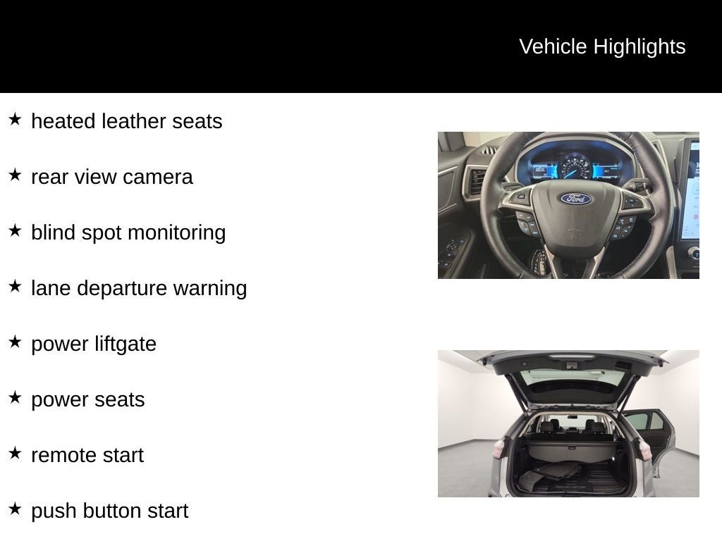 This is a one owner 2022 Ford Edge SEL with a clean Carfax. It's equipped with a. EcoBoost 2.0L I4 Turbocharged VCT heated leather seats, rear view camera, blind spot monitoring, lane departure warning, power liftgate, power seats, remote start, push button start, dual zone climate control, Sync4 voice activation, 18 aluminum wheels and more.