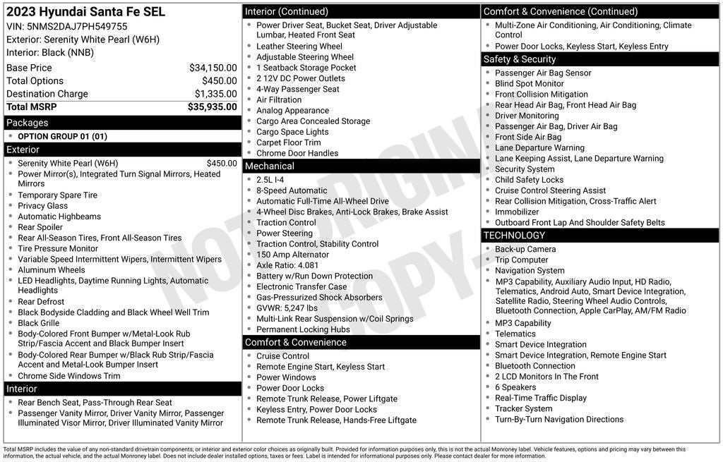 This 2023 Hyundai Santa Fe SEL has a clean Carfax. It's equipped with a 2.5L I4, heated seats, navigation, rear view camera, blind spot monitoring, power driver seat, remote start, push button start, dual zone climate control, 18 aluminum wheels and more.