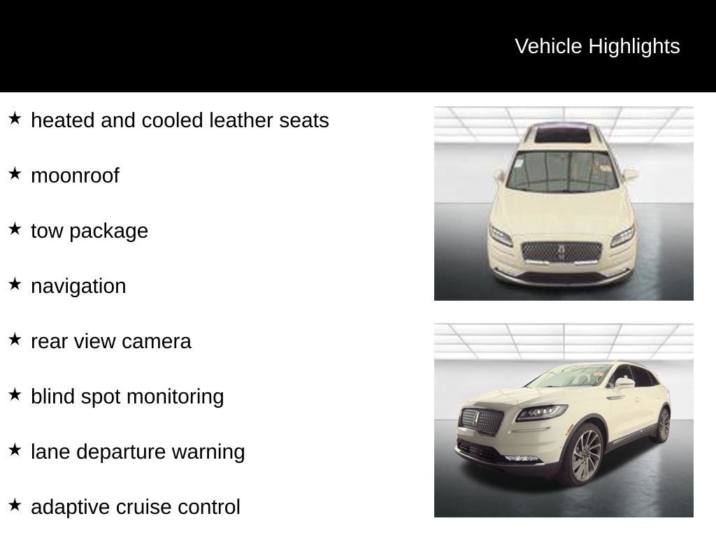 This is a one owner 2023 Lincoln Nautilus Reserve with a clean Carfax. It's equipped with a. 2.0L Turbocharged heated and cooled leather seats, moonroof, tow package, navigation, rear view camera, blind spot monitoring, lane departure warning, adaptive cruise control, power liftgate, power seats with driver's memory seat, remote start, push button start, dual zone climate control, Sync4 voice activation, 21 aluminum wheels and more.