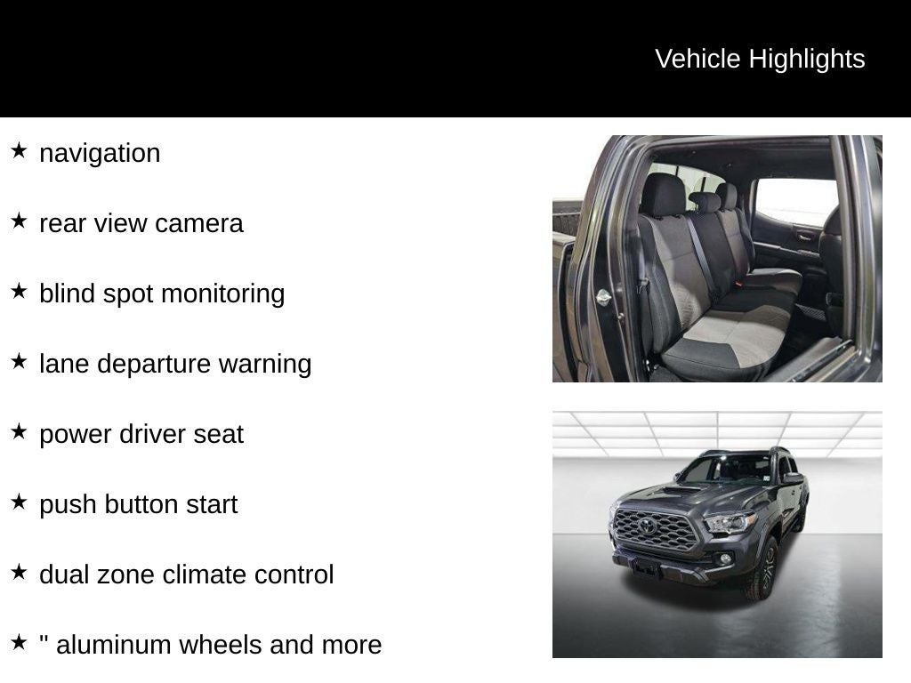This is a one owner 2023 Toyota Tacoma TRD Sport. It's equipped with a 3.5L V6, navigation, rear view camera, blind spot monitoring, lane departure warning, power driver seat, push button start, dual zone climate control, 17 aluminum wheels and more.